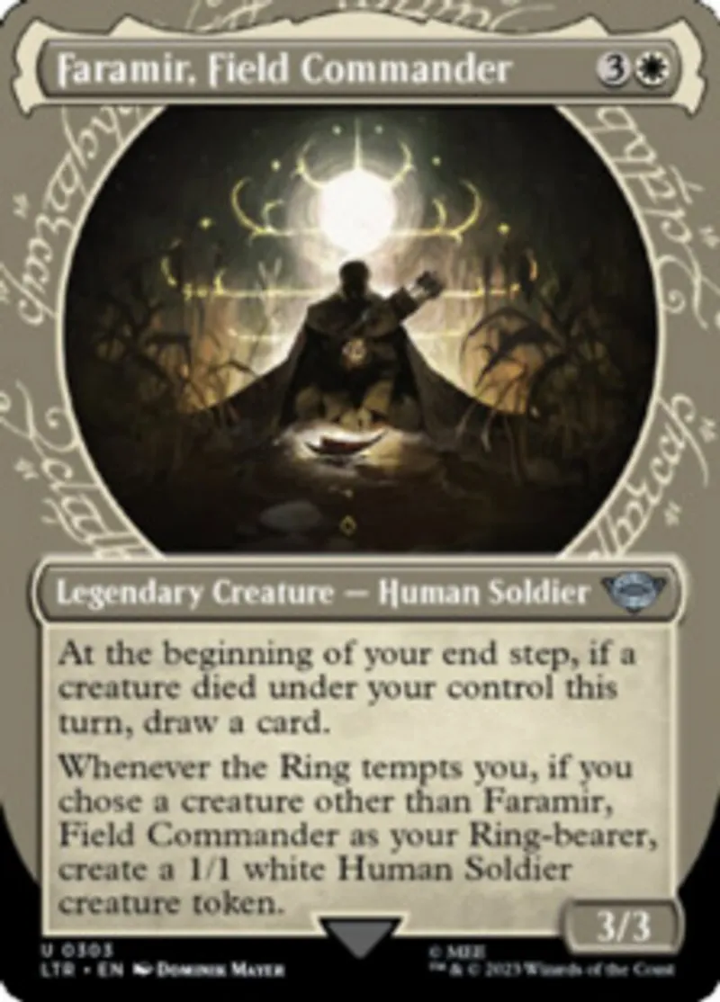Whenever the Ring tempts you, if you chose a creature other than Faramir, Field Commander as your Ring-bearer, create a 1/1 white Human Soldier creature token. | ||