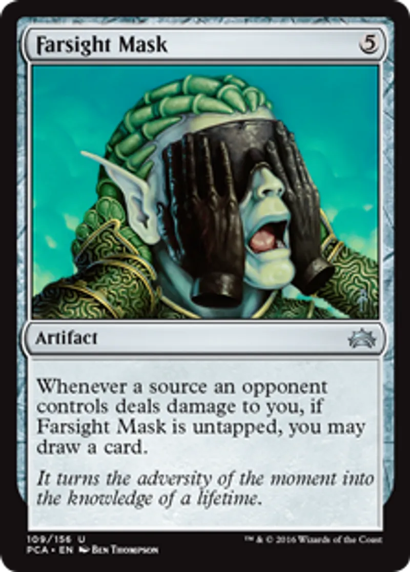 | Oracle Text | Whenever a source an opponent controls deals damage to you, if Farsight Mask is untapped, you may draw a card. | ||