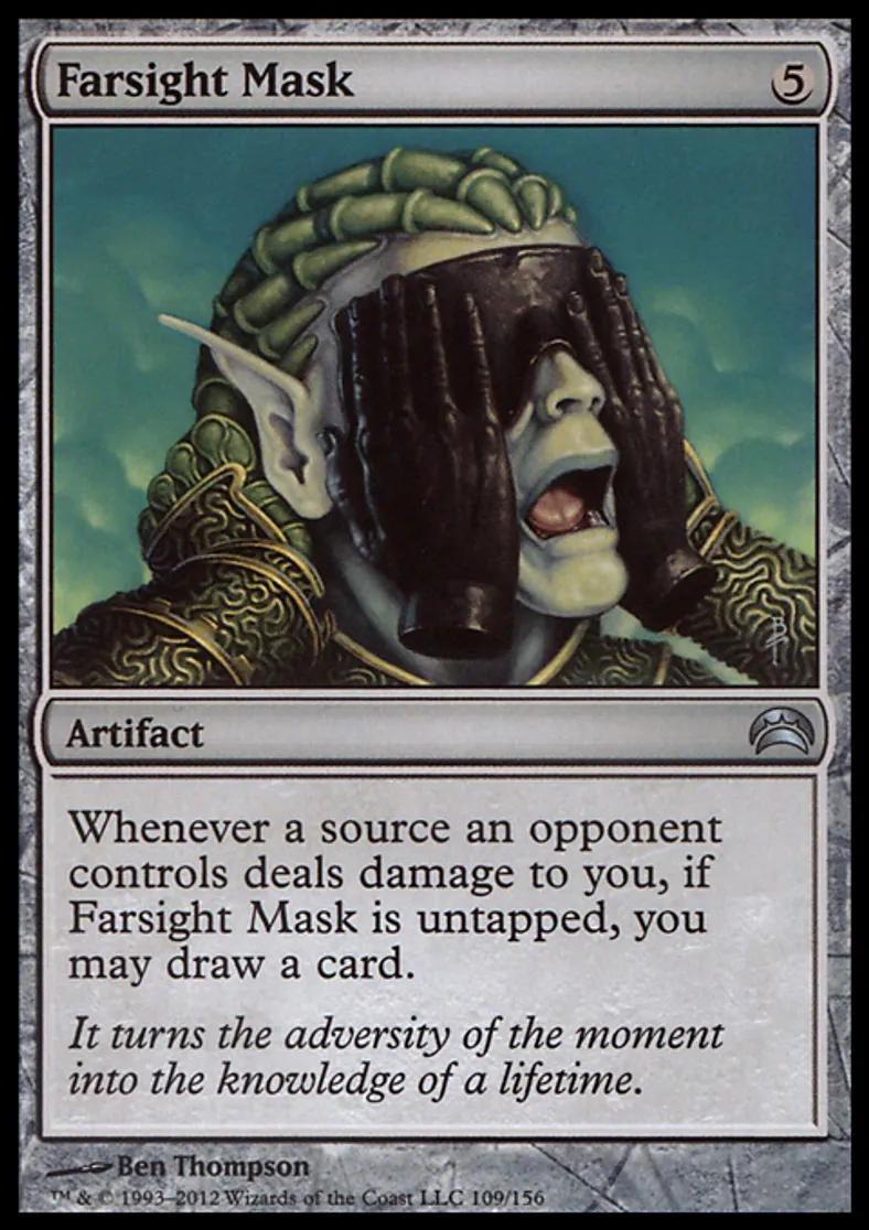 | Oracle Text | Whenever a source an opponent controls deals damage to you, if Farsight Mask is untapped, you may draw a card. | ||