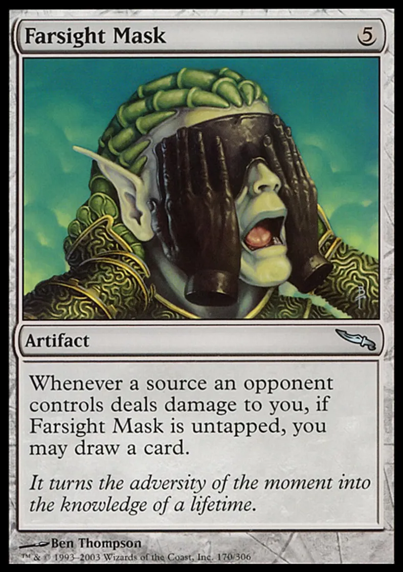 | Oracle Text | Whenever a source an opponent controls deals damage to you, if Farsight Mask is untapped, you may draw a card. | ||