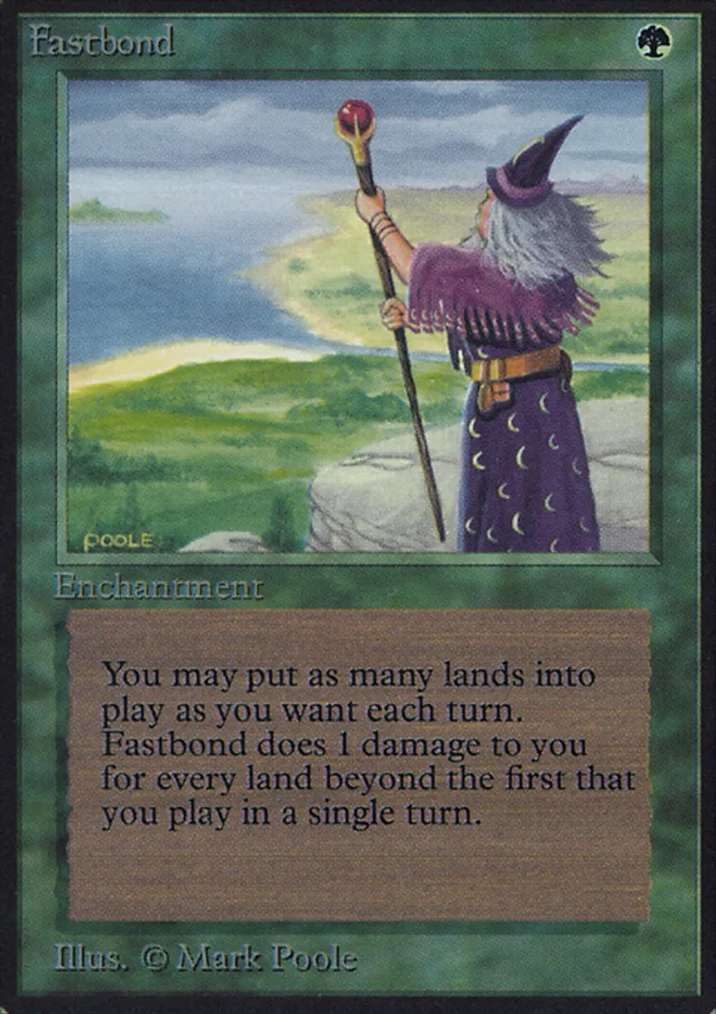 | Oracle Text | You may play any number of additional lands on each of your turns. Whenever you play a land, if it wasn't the first land you played this turn, Fastbond deals 1 damage to you. | ||