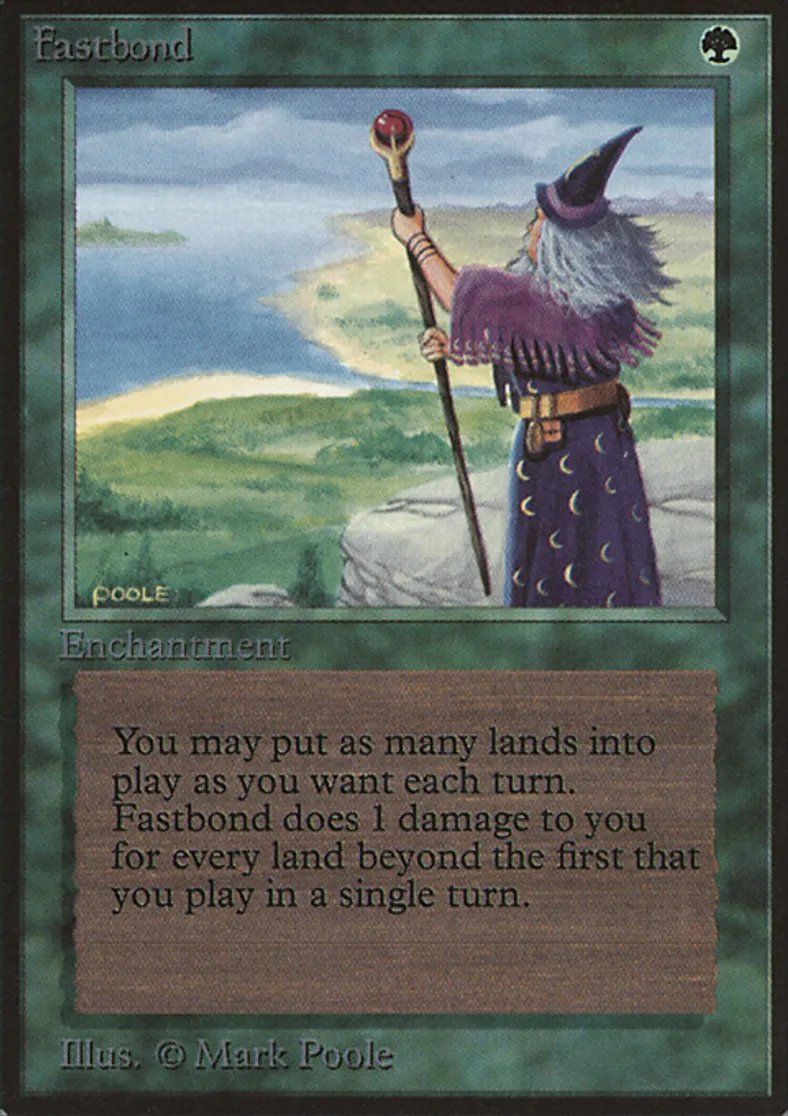 | Oracle Text | You may play any number of additional lands on each of your turns. Whenever you play a land, if it wasn't the first land you played this turn, Fastbond deals 1 damage to you. | ||