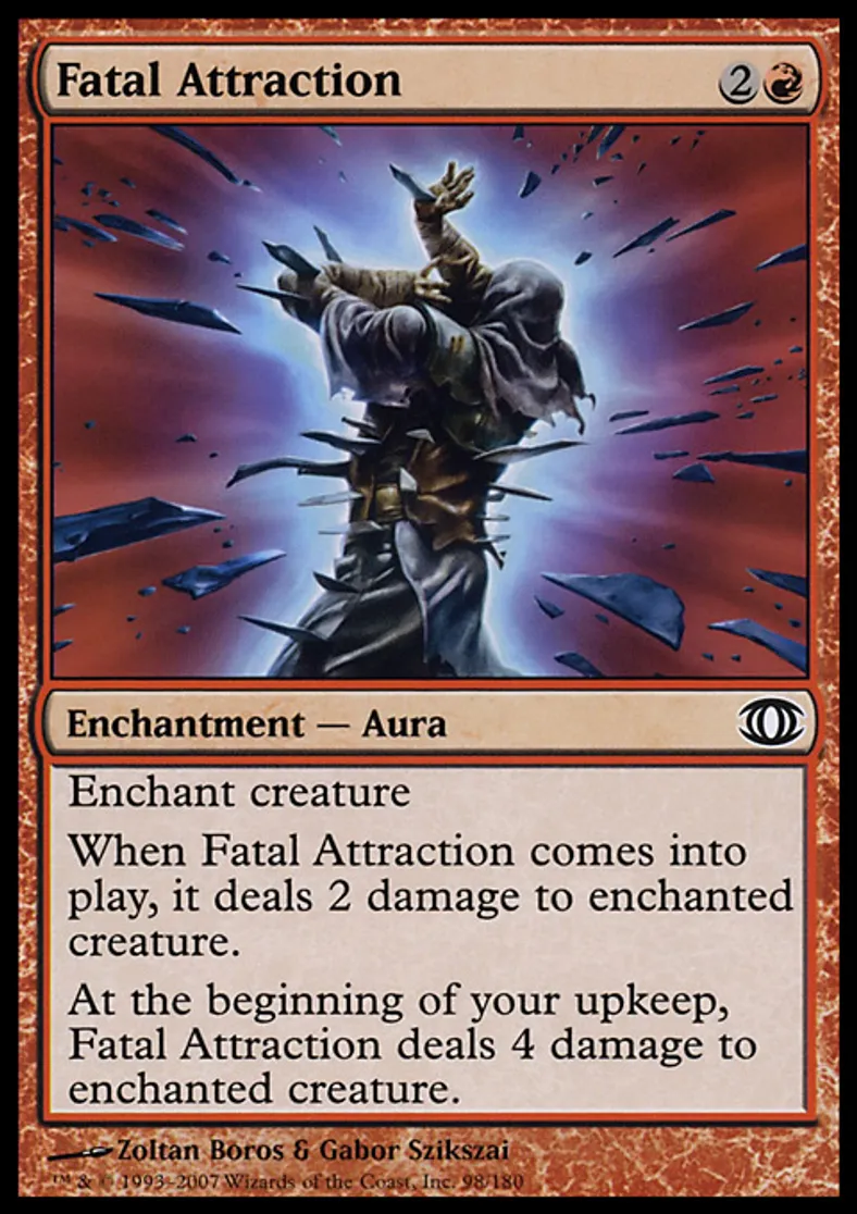 | Oracle Text | Enchant creature When Fatal Attraction enters the battlefield, it deals 2 damage to enchanted creature. At the beginning of your upkeep, Fatal Attraction deals 4 damage to enchanted creature. | ||