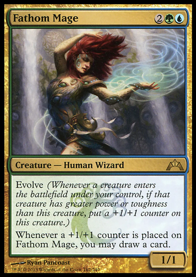 | Oracle Text | Evolve (Whenever a creature enters the battlefield under your control, if that creature has greater power or toughness than this creature, put a +1/+1 counter on this creature.) Whenever a +1/+1 counter is placed on Fathom Mage, you may draw a card. | ||