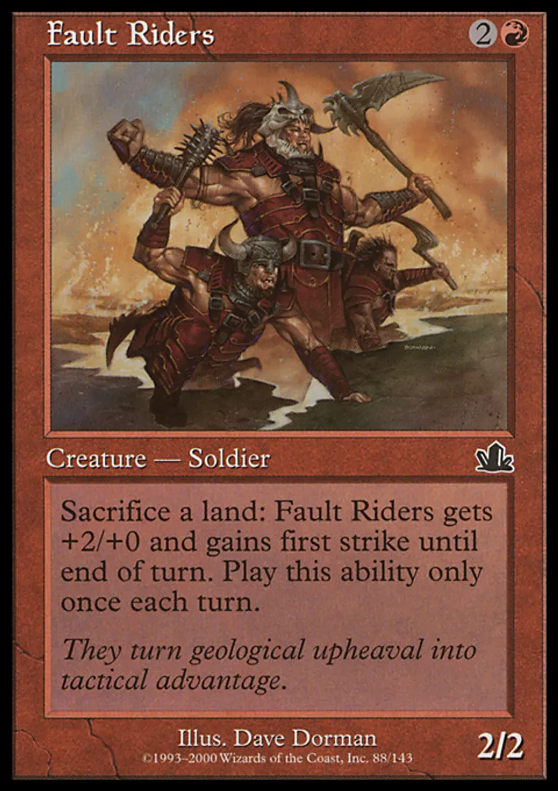 | Oracle Text | Sacrifice a land: Fault Riders gets +2/+0 and gains first strike until end of turn. Activate this ability only once each turn. | ||