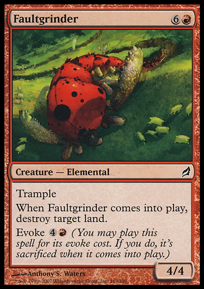| Oracle Text | Trample When Faultgrinder enters the battlefield, destroy target land. Evoke {{4}}{{r}} (You may cast this spell for its evoke cost. If you do, it's sacrificed when it enters the battlefield.) | ||