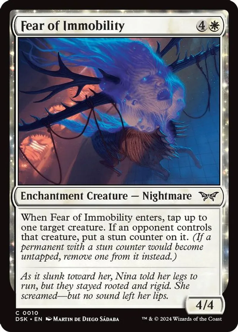 | Oracle Text | when fear of immobility enters, tap up to one target creature. if an opponent controls that creature, put a stun counter on it. (if a permanent with a stun counter would become untapped, remove one from it instead.) | ||