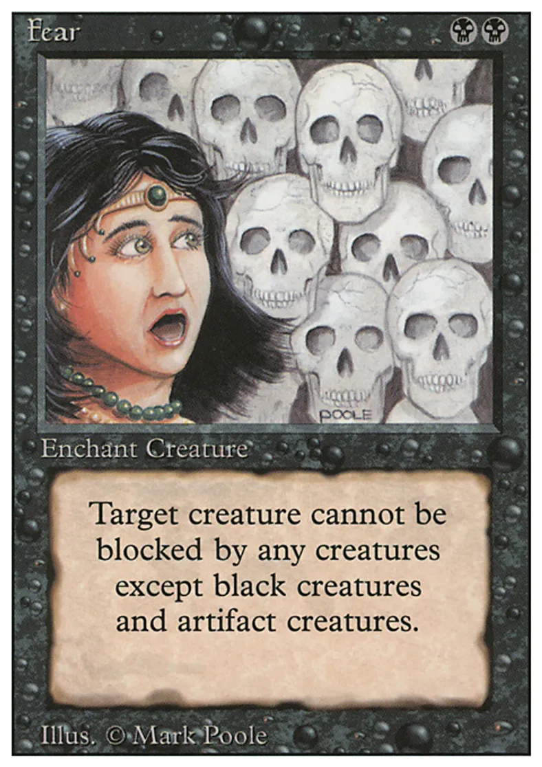 | Oracle Text | Enchant creature (Target a creature as you cast this. This card enters the battlefield attached to that creature.) Enchanted creature has fear. (It can't be blocked except by artifact creatures and/or black creatures.) | ||