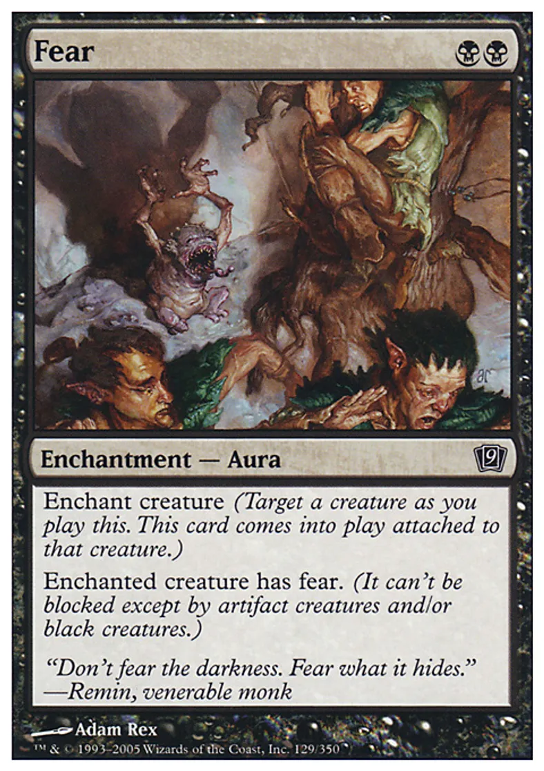 | Oracle Text | Enchant creature (Target a creature as you cast this. This card enters the battlefield attached to that creature.) Enchanted creature has fear. (It can't be blocked except by artifact creatures and/or black creatures.) | ||