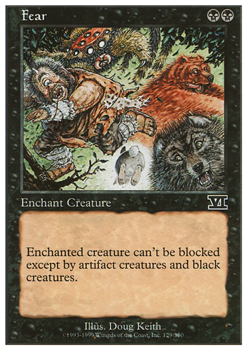| Oracle Text | Enchant creature (Target a creature as you cast this. This card enters the battlefield attached to that creature.) Enchanted creature has fear. (It can't be blocked except by artifact creatures and/or black creatures.) | ||