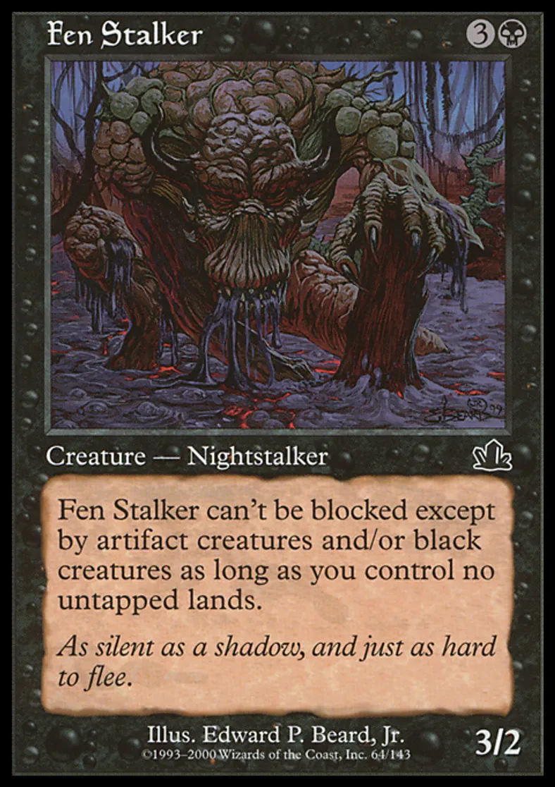 | Oracle Text | Fen Stalker has fear as long as you control no untapped lands. (It can't be blocked except by artifact creatures and/or black creatures.) | ||