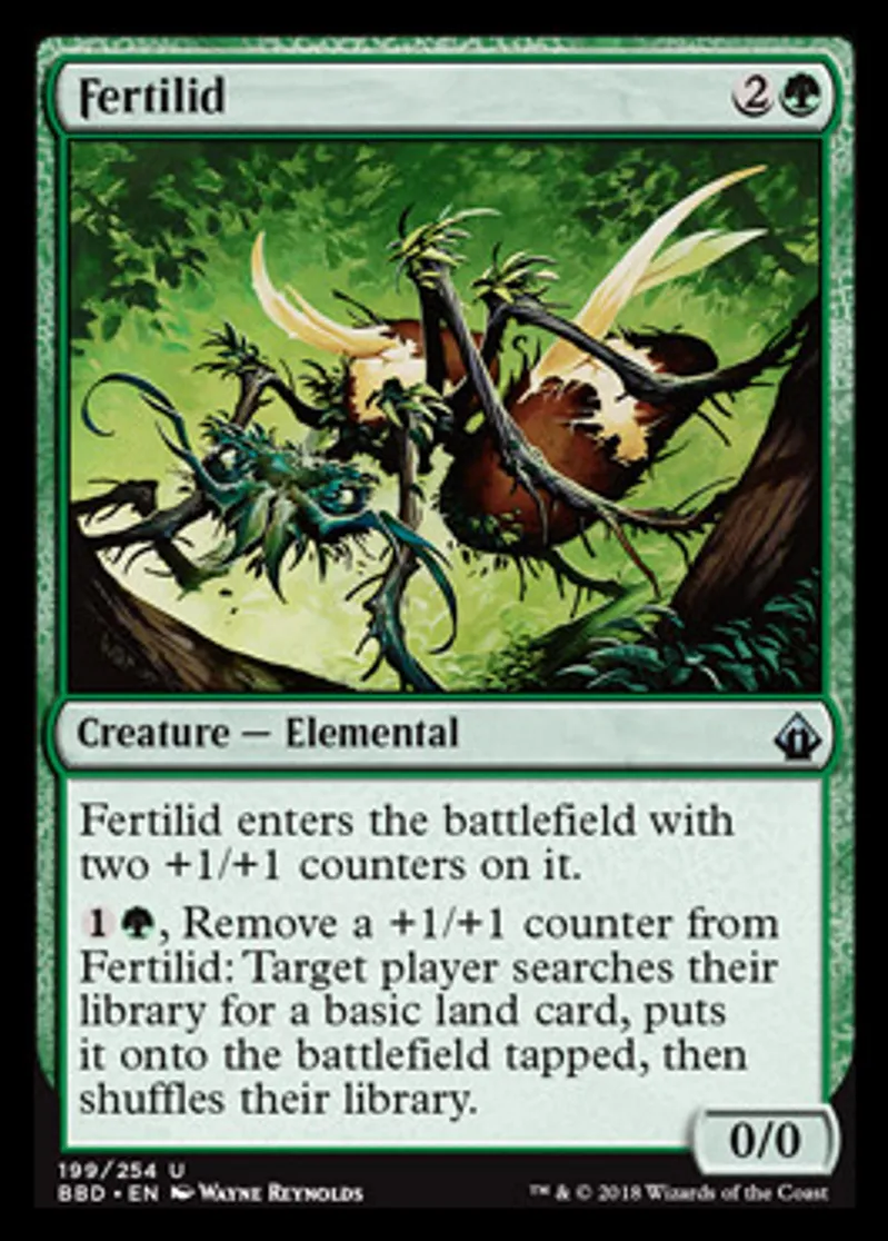 | Oracle Text | Fertilid enters the battlefield with two +1/+1 counters on it. {{1}}{{g}}, Remove a +1/+1 counter from Fertilid: Target player searches their library for a basic land card, puts it onto the battlefield tapped, then shuffles their library. | ||