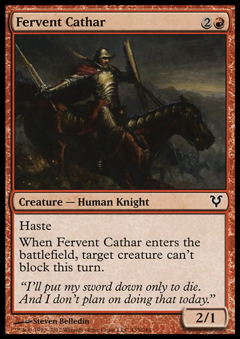 | Oracle Text | Haste When Fervent Cathar enters the battlefield, target creature can't block this turn. | ||