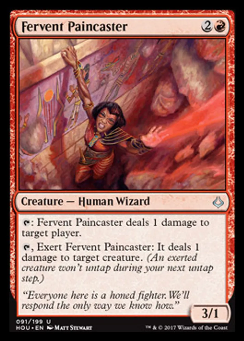 | Oracle Text | {{t}}: Fervent Paincaster deals 1 damage to target player. {{t}}, Exert Fervent Paincaster: It deals 1 damage to target creature. (An exerted creature won't untap during your next untap step.) | ||