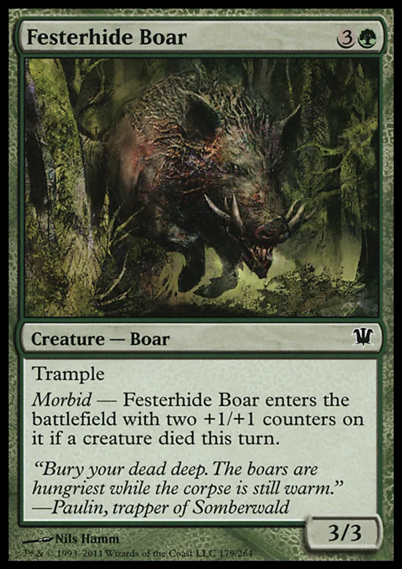 | Oracle Text | Trample Morbid — Festerhide Boar enters the battlefield with two +1/+1 counters on it if a creature died this turn. | ||