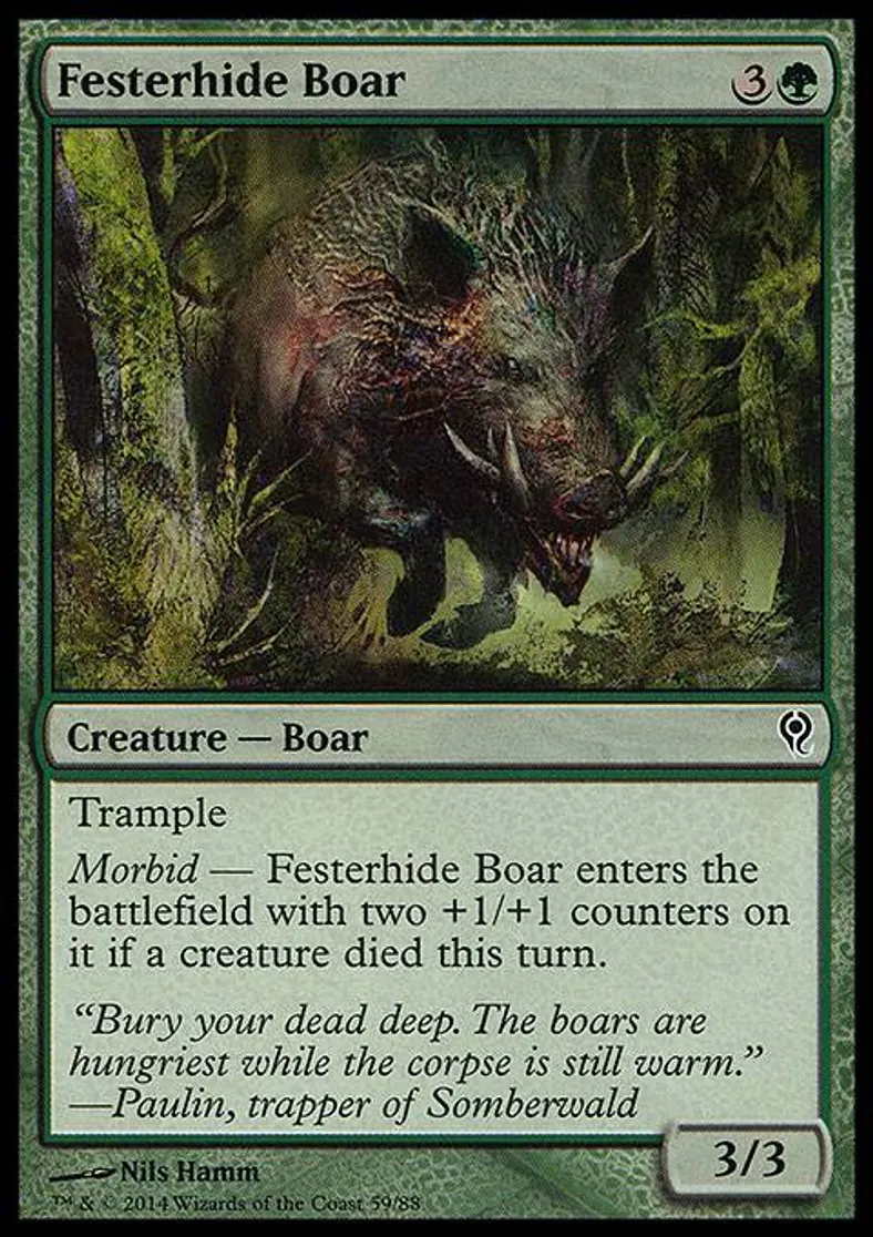 Morbid — Festerhide Boar enters the battlefield with two +1/+1 counters on it if a creature died this turn. | ||