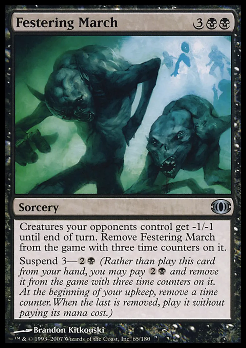 | Oracle Text | Creatures your opponents control get -1/-1 until end of turn. Exile Festering March with three time counters on it. Suspend 3—{{2}}{{b}} (Rather than cast this card from your hand, you may pay {{2}}{{b}} and exile it with three time counters on it. At the beginning of your upkeep, remove a time counter. When the last is removed, cast it without paying its mana cost.) | ||