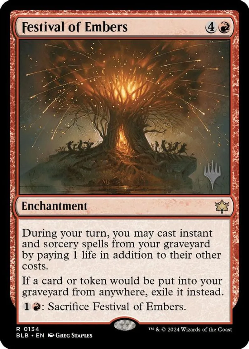 | Oracle Text | during your turn, you may cast instant and sorcery spells from your graveyard by paying 1 life in addition to their other costs. if a card or token would be put into your graveyard from anywhere, exile it instead. 1r: sacrifice festival of embers. | ||