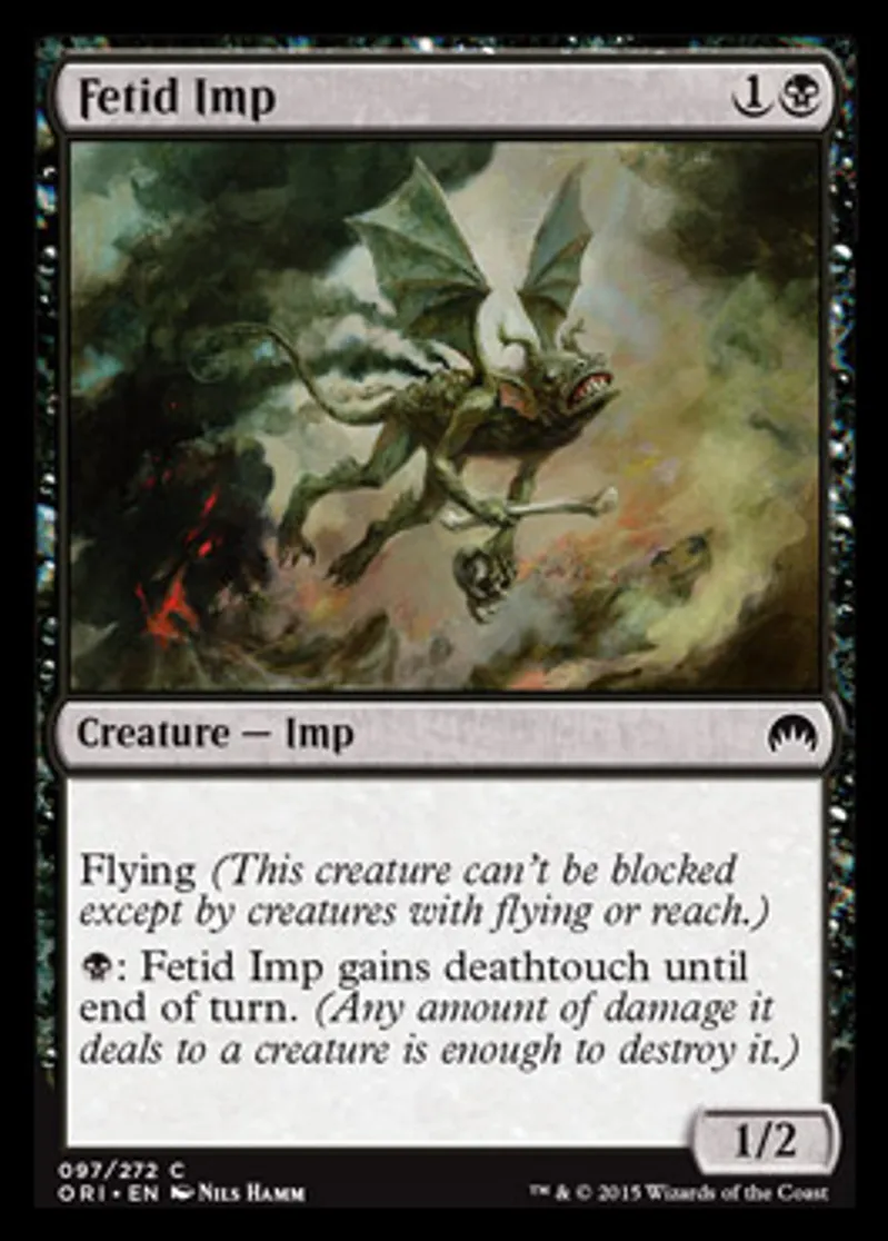| Oracle Text | Flying (This creature can't be blocked except by creatures with flying or reach.) {{b}}: Fetid Imp gains deathtouch until end of turn. (Any amount of damage it deals to a creature is enough to destroy it.) | ||