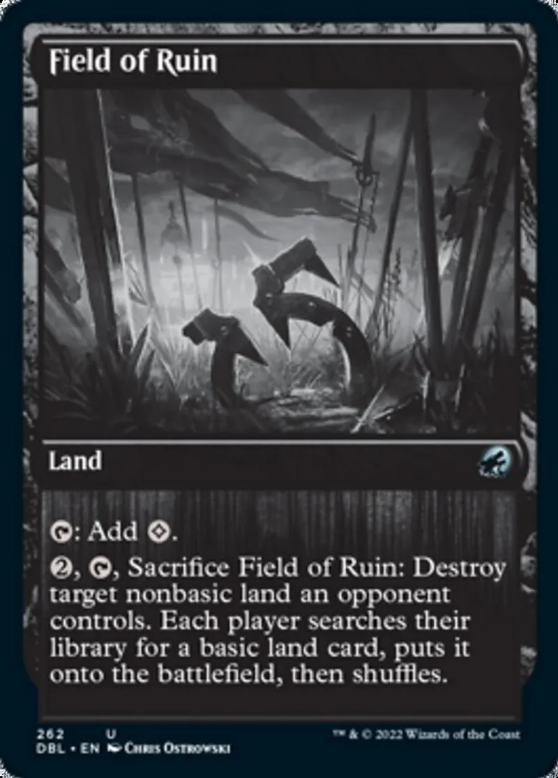 {2}, {T}, Sacrifice Field of Ruin: Destroy target nonbasic land an opponent controls. Each player searches their library for a basic land card, puts it onto the battlefield, then shuffles. | ||