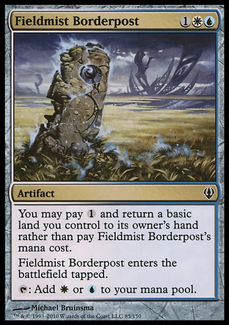 | Oracle Text | You may pay {{1}} and return a basic land you control to its owner's hand rather than pay Fieldmist Borderpost's mana cost. Fieldmist Borderpost enters the battlefield tapped. {{t}}: Add {{w}} or {{u}} to your mana pool. | ||