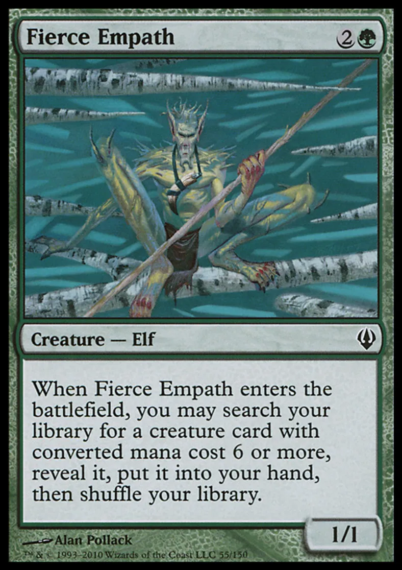 | Oracle Text | When Fierce Empath enters the battlefield, you may search your library for a creature card with converted mana cost 6 or greater, reveal it, put it into your hand, then shuffle your library. | ||