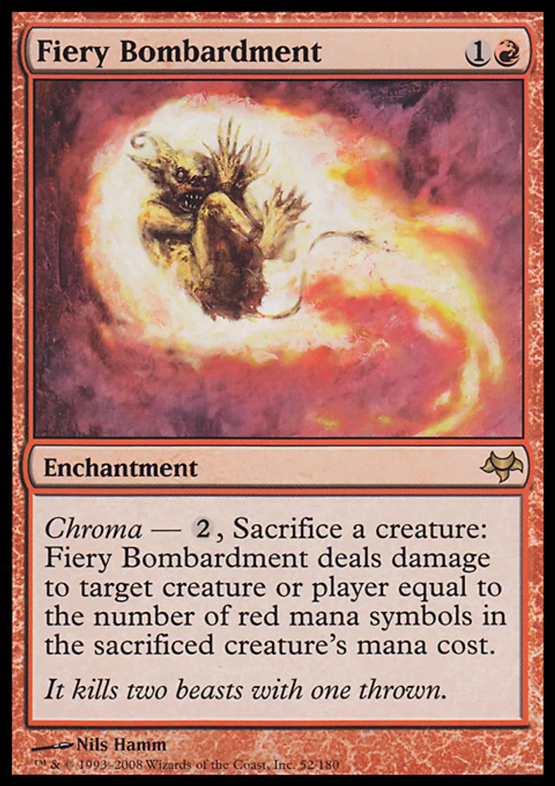 | Oracle Text | Chroma — {{2}}, Sacrifice a creature: Fiery Bombardment deals damage to target creature or player equal to the number of red mana symbols in the sacrificed creature's mana cost. | ||