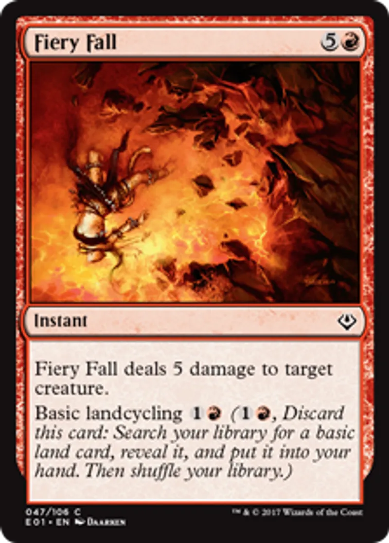 | Oracle Text | Fiery Fall deals 5 damage to target creature. Basic landcycling {{1}}{{r}} ({{1}}{{r}}, Discard this card: Search your library for a basic land card, reveal it, and put it into your hand. Then shuffle your library.) | ||