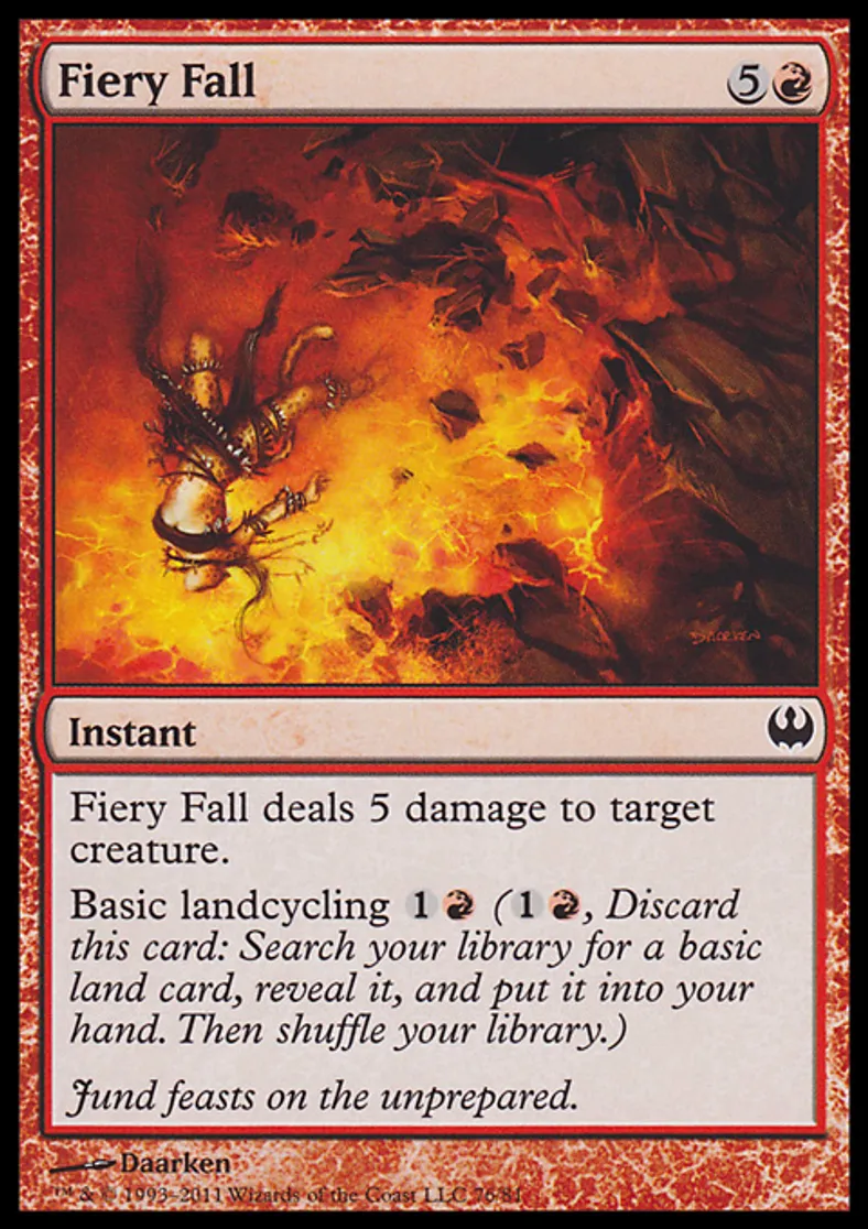 | Oracle Text | Fiery Fall deals 5 damage to target creature. Basic landcycling {{1}}{{r}} ({{1}}{{r}}, Discard this card: Search your library for a basic land card, reveal it, and put it into your hand. Then shuffle your library.) | ||