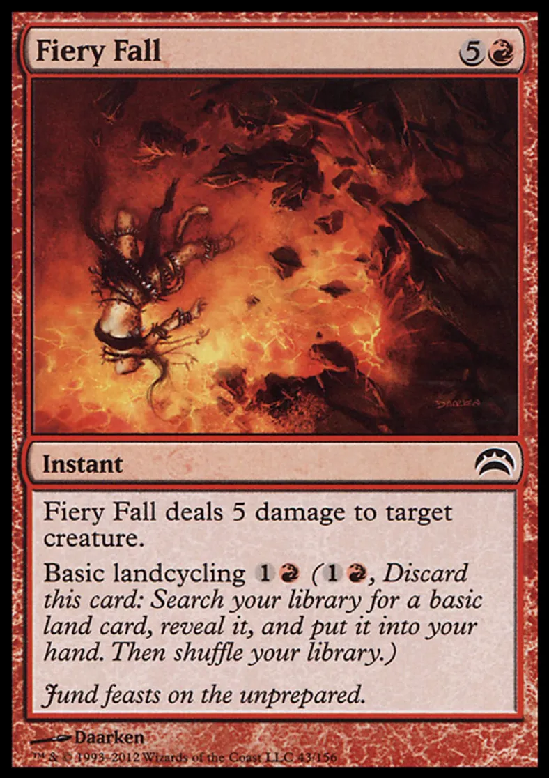 | Oracle Text | Fiery Fall deals 5 damage to target creature. Basic landcycling {{1}}{{r}} ({{1}}{{r}}, Discard this card: Search your library for a basic land card, reveal it, and put it into your hand. Then shuffle your library.) | ||