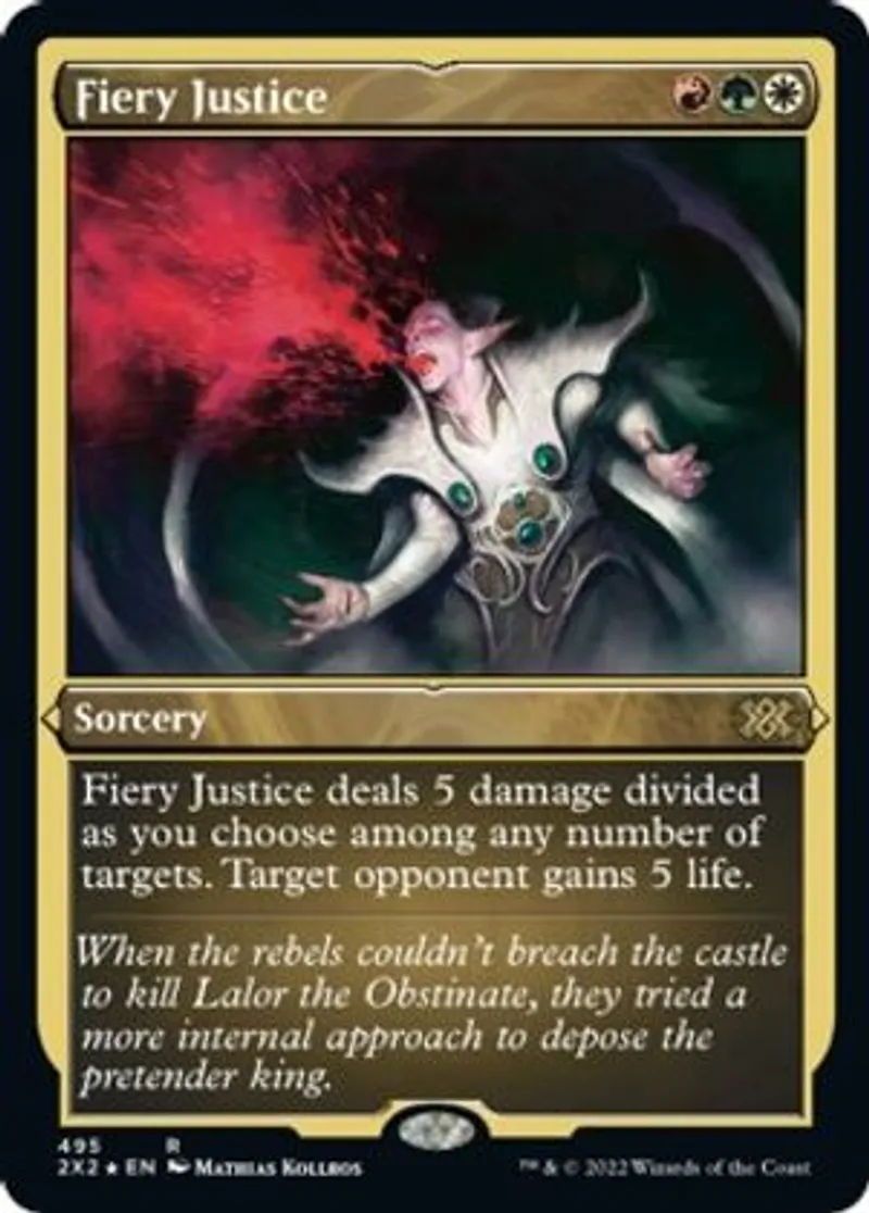 | Oracle Text | Fiery Justice deals 5 damage divided as you choose among any number of targets. Target opponent gains 5 life. | ||