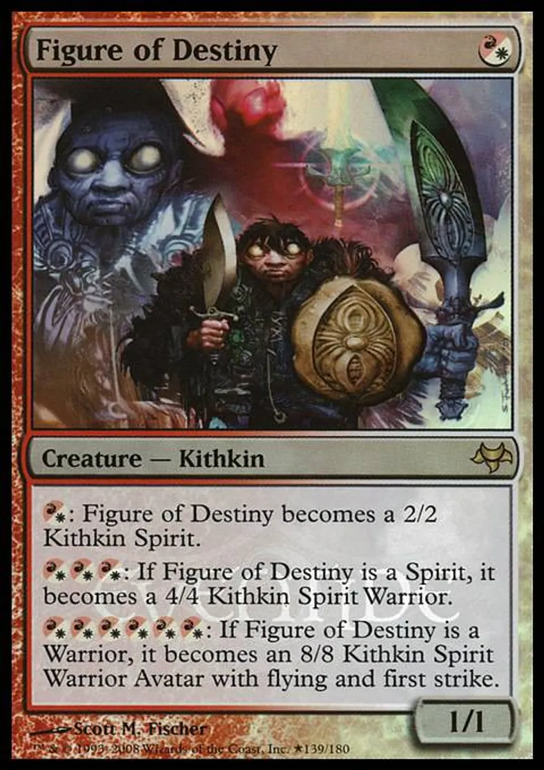 {R/W}{R/W}{R/W}{R/W}{R/W}{R/W}: If Figure of Destiny is a Warrior, it becomes a Kithkin Spirit Warrior Avatar with base power and toughness 8/8, flying, and first strike. | ||