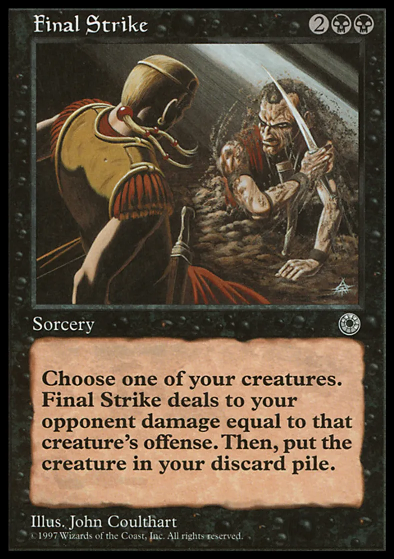 | Oracle Text | As an additional cost to cast Final Strike, sacrifice a creature. Final Strike deals damage to target opponent equal to the sacrificed creature's power. | ||