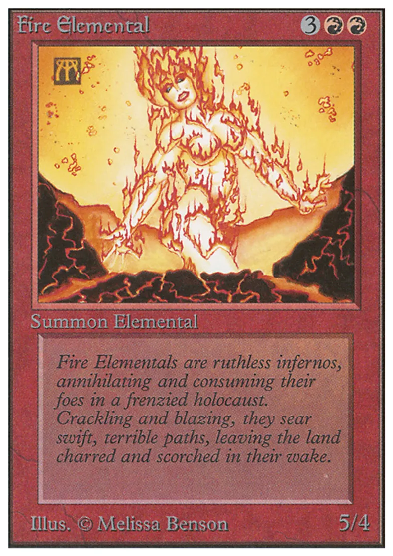 | Flavor Text | Fire Elementals are ruthless infernos, annihilating and consuming their foes in a frenzied holocaust. Crackling and blazing, they sear swift, terrible paths, leaving the land charred and scorched in their wake. | ||