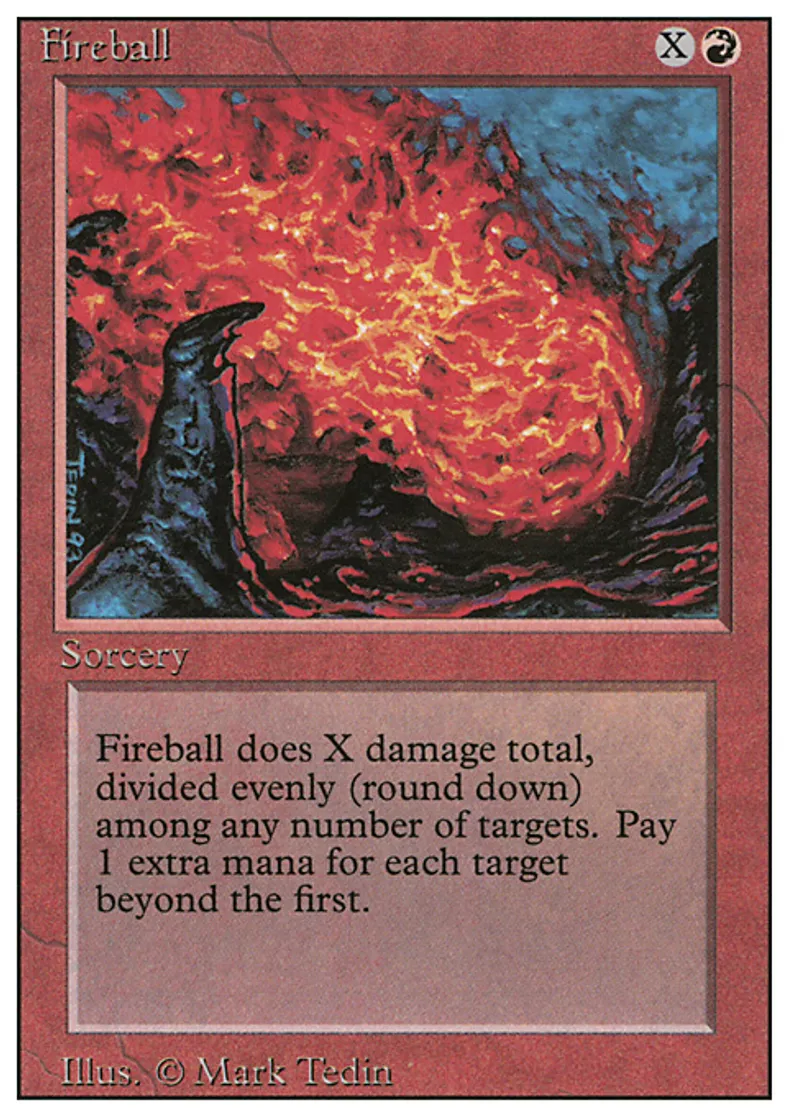 | Oracle Text | Fireball deals X damage divided evenly, rounded down, among any number of target creatures and/or players. Fireball costs {{1}} more to cast for each target beyond the first. | ||