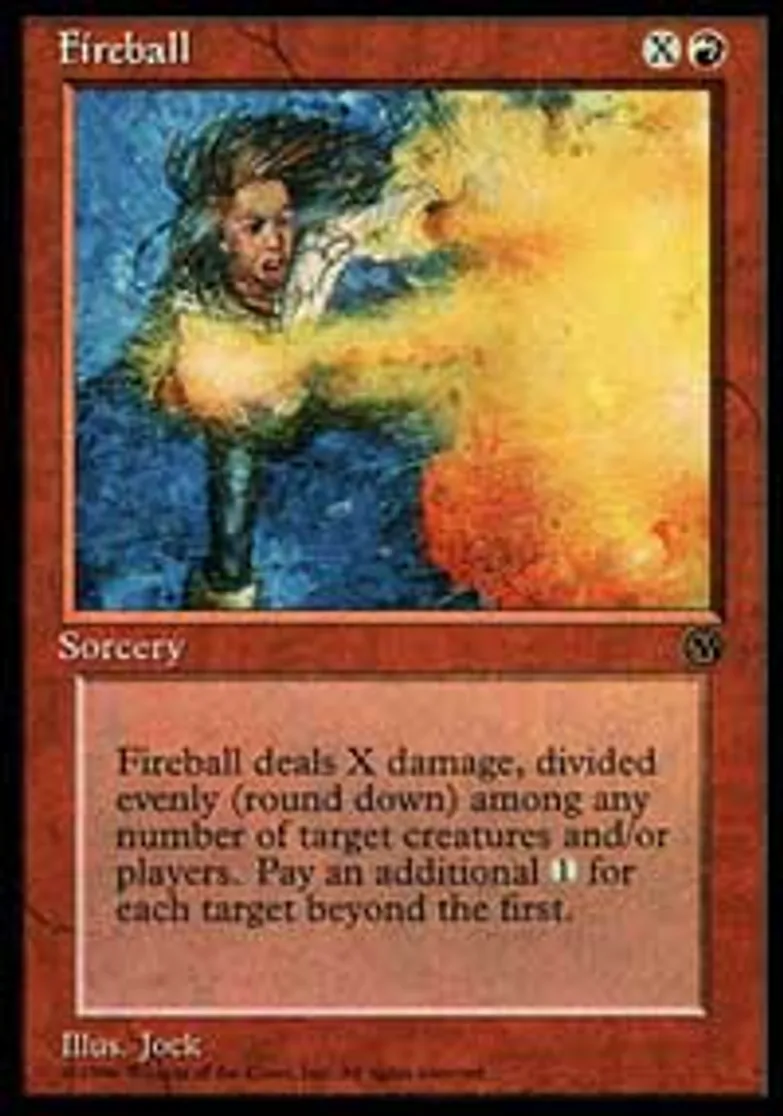 | Oracle Text | Fireball deals X damage divided evenly, rounded down, among any number of target creatures and/or players. Fireball costs {{1}} more to cast for each target beyond the first. | ||