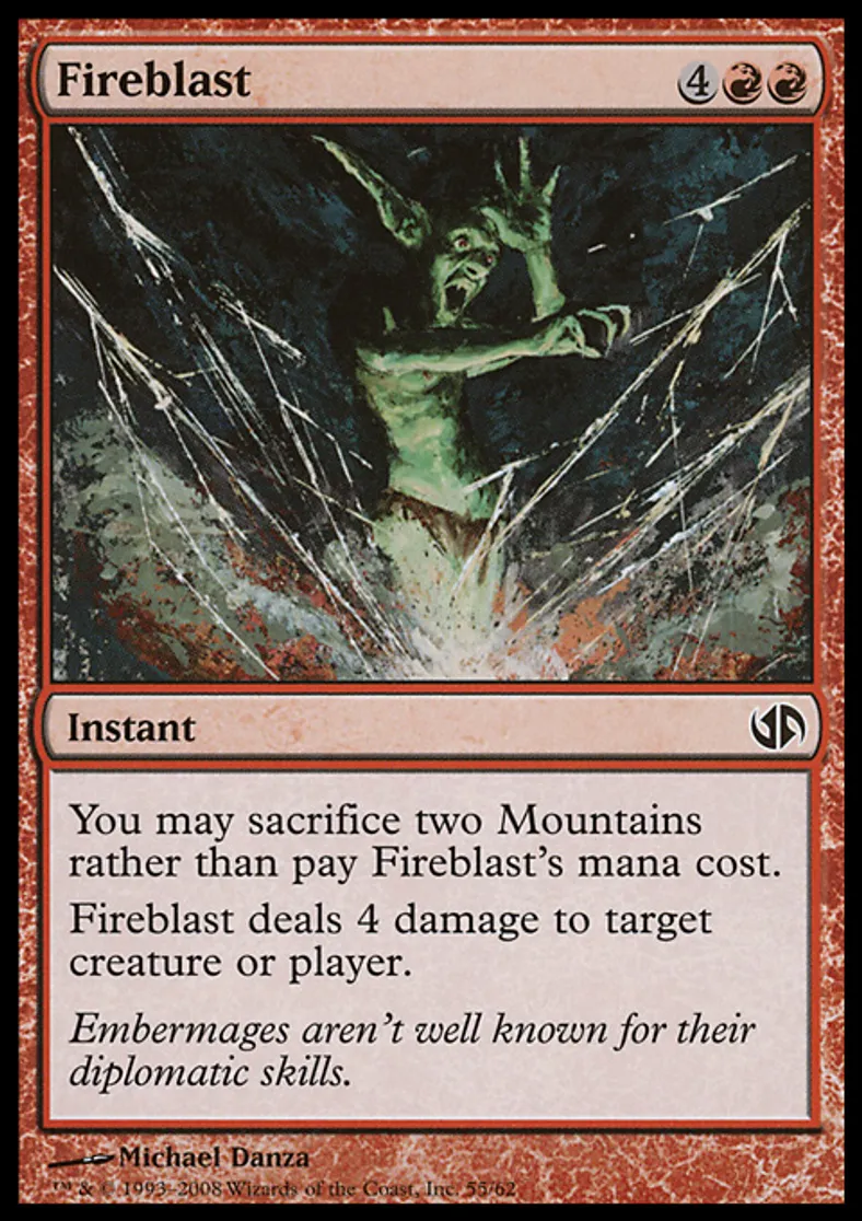 | Oracle Text | You may sacrifice two Mountains rather than pay Fireblast's mana cost. Fireblast deals 4 damage to target creature or player. | ||