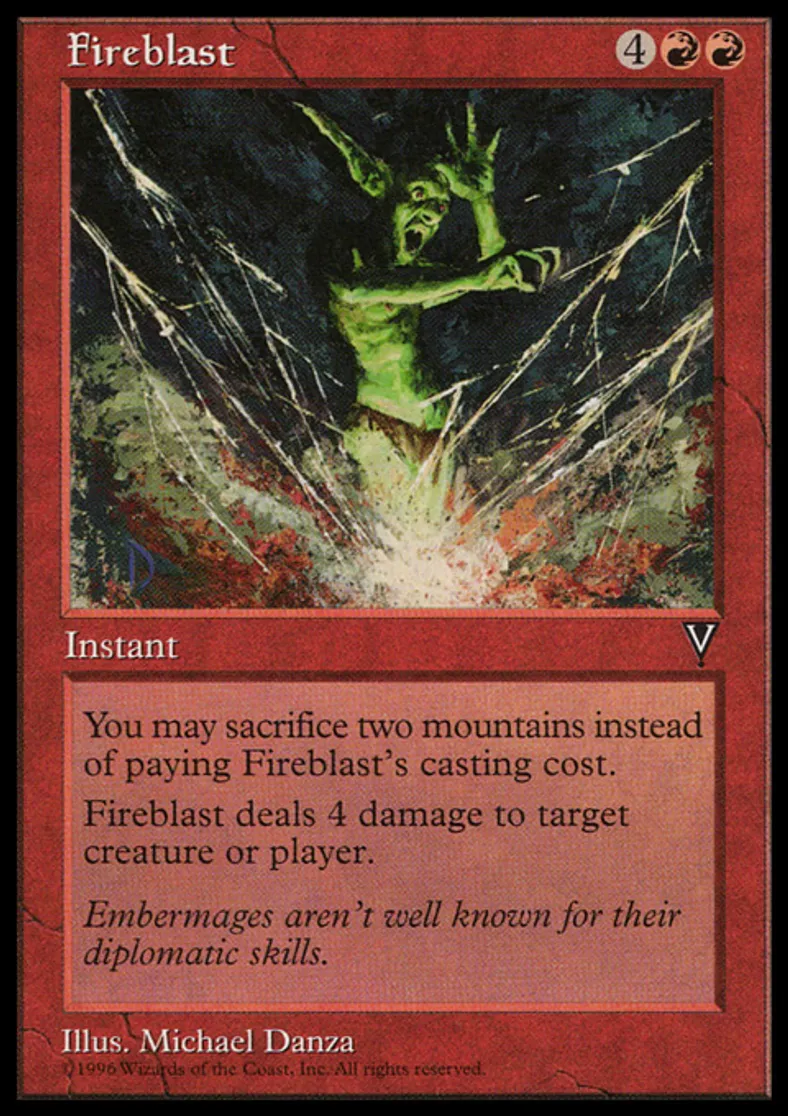 | Oracle Text | You may sacrifice two Mountains rather than pay Fireblast's mana cost. Fireblast deals 4 damage to target creature or player. | ||