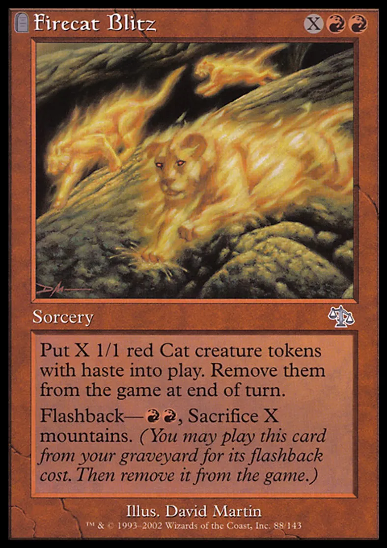 | Oracle Text | Put X 1/1 red Elemental Cat creature tokens with haste onto the battlefield. Exile them at the beginning of the next end step. Flashback—{{r}}{{r}}, Sacrifice X Mountains. (You may cast this card from your graveyard for its flashback cost. Then exile it.) | ||