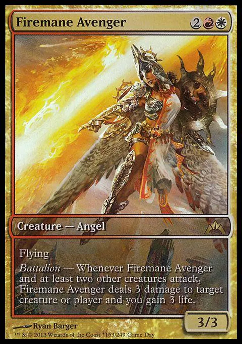 Battalion — Whenever Firemane Avenger and at least two other creatures attack, Firemane Avenger deals 3 damage to target creature or player and you gain 3 life. | ||