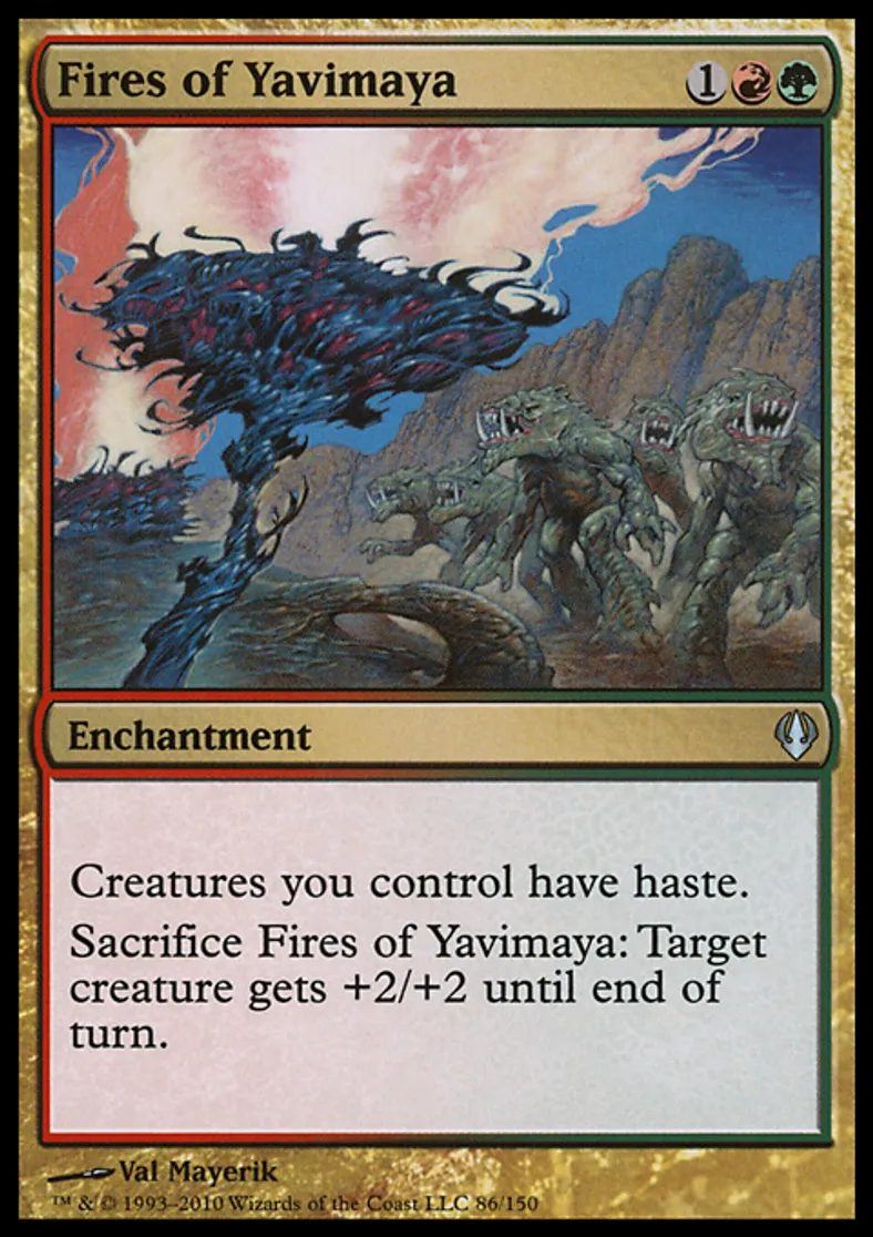 | Oracle Text | Creatures you control have haste. Sacrifice Fires of Yavimaya: Target creature gets +2/+2 until end of turn. | ||