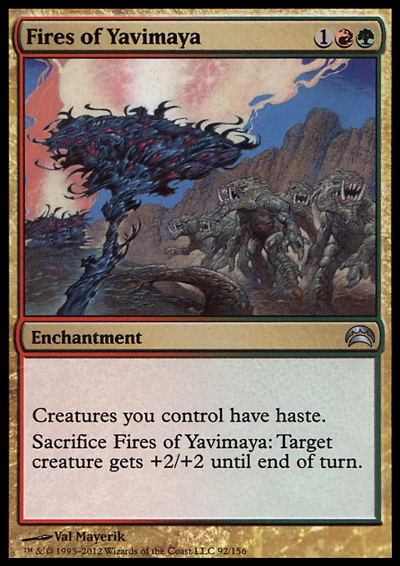 | Oracle Text | Creatures you control have haste. Sacrifice Fires of Yavimaya: Target creature gets +2/+2 until end of turn. | ||