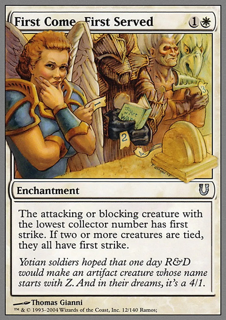 | Oracle Text | The attacking or blocking creature with the lowest collector number has first strike. If two or more creatures are tied, they all have first strike. | ||