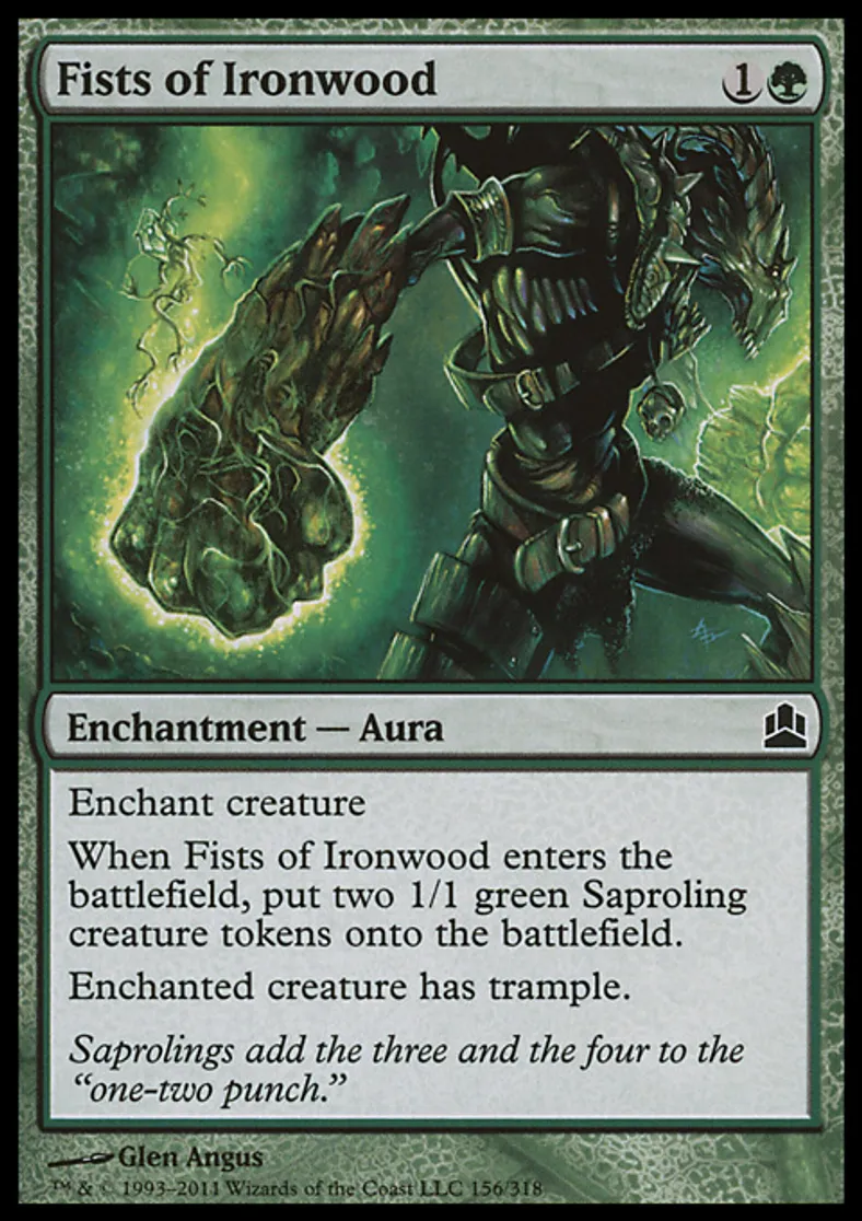 | Oracle Text | Enchant creature When Fists of Ironwood enters the battlefield, put two 1/1 green Saproling creature tokens onto the battlefield. Enchanted creature has trample. | ||