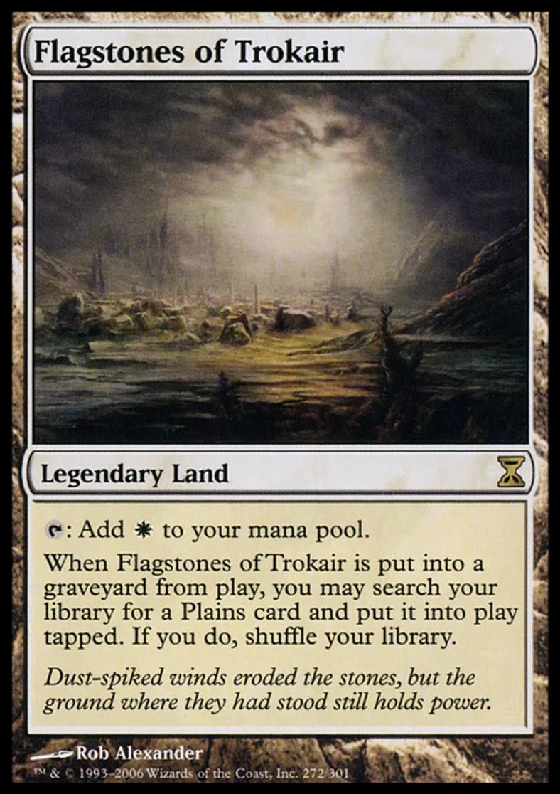 | Oracle Text | {{t}}: Add {{w}} to your mana pool. When Flagstones of Trokair is put into a graveyard from the battlefield, you may search your library for a Plains card and put it onto the battlefield tapped. If you do, shuffle your library. | ||