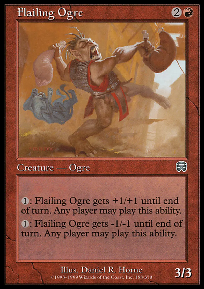 | Oracle Text | {{1}}: Flailing Ogre gets +1/+1 until end of turn. Any player may activate this ability. {{1}}: Flailing Ogre gets -1/-1 until end of turn. Any player may activate this ability. | ||