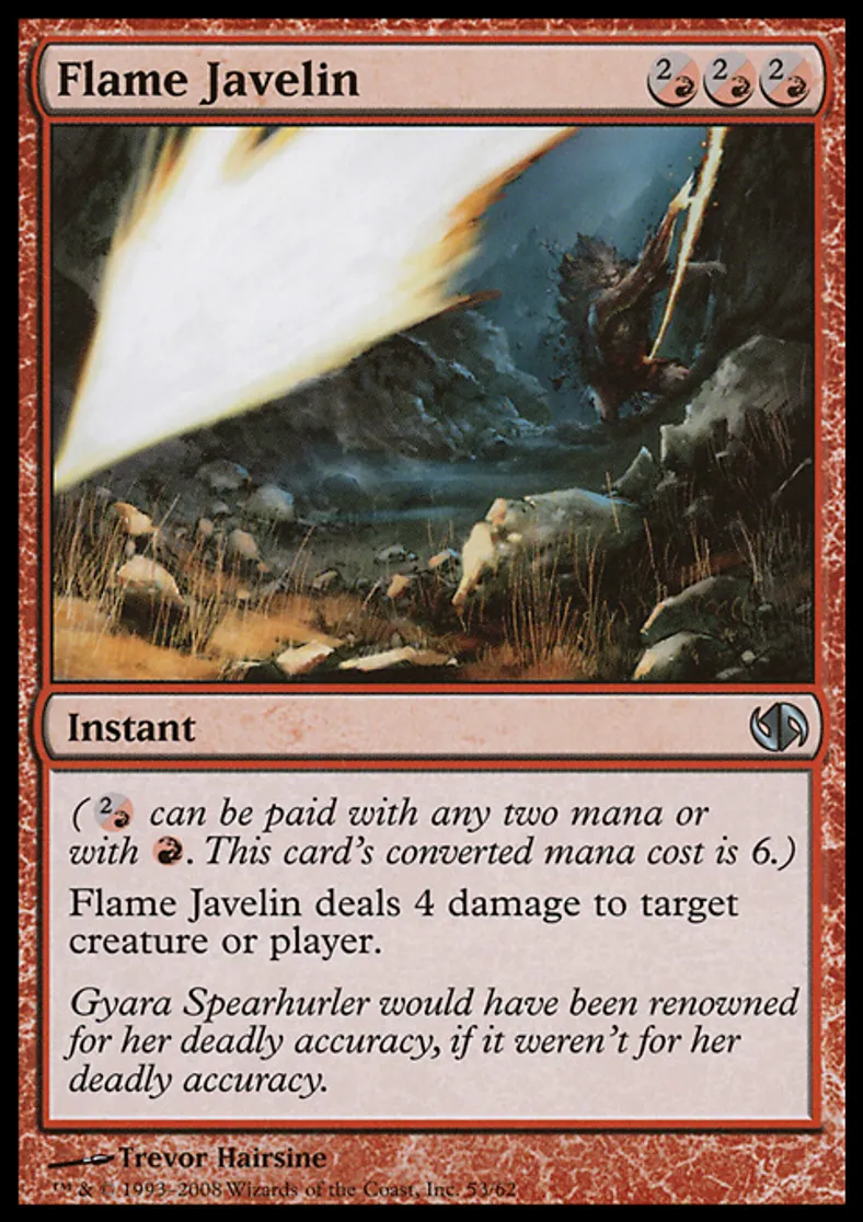 | Oracle Text | ({{Two or Red}} can be paid with any two mana or with {{r}}. This card's converted mana cost is 6.) Flame Javelin deals 4 damage to target creature or player. | ||