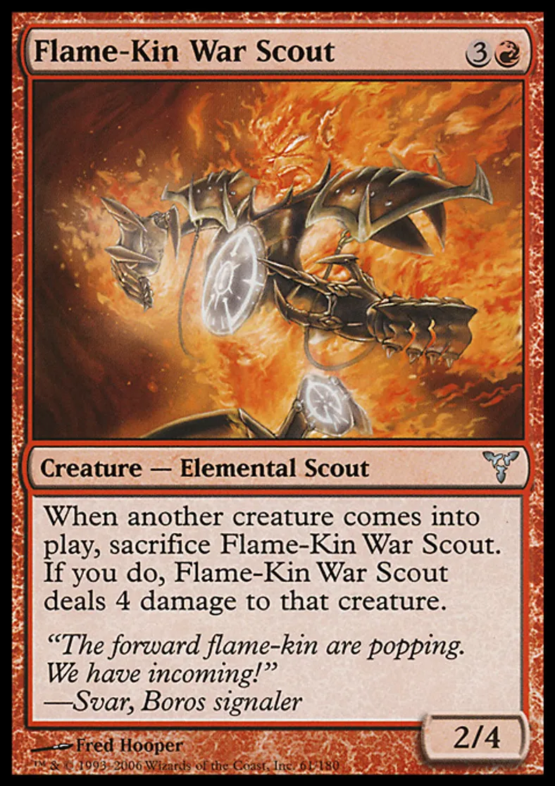 | Oracle Text | When another creature enters the battlefield, sacrifice Flame-Kin War Scout. If you do, Flame-Kin War Scout deals 4 damage to that creature. | ||