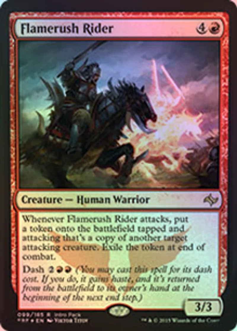 | Oracle Text | Whenever Flamerush Rider attacks, put a token onto the battlefield tapped and attacking that's a copy of another target attacking creature. Exile the token at end of combat.