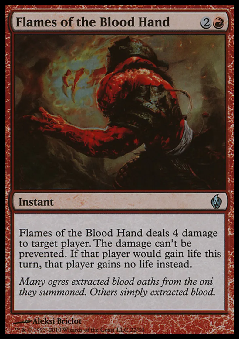 | Oracle Text | Flames of the Blood Hand deals 4 damage to target player. The damage can't be prevented. If that player would gain life this turn, that player gains no life instead. | ||
